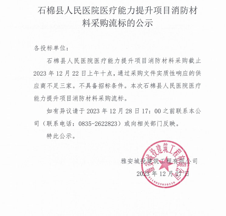 石棉縣人民醫(yī)院醫(yī)療能力提升項(xiàng)目消防材料采購(gòu)流標(biāo)的公示