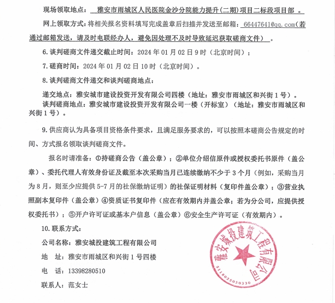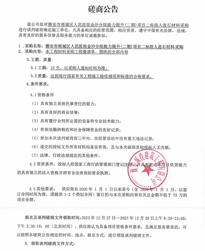 雅安市雨城區(qū)人民醫(yī)院金沙分院能力提升(二期)項目二標(biāo)段人造石材料采購談判磋商公告