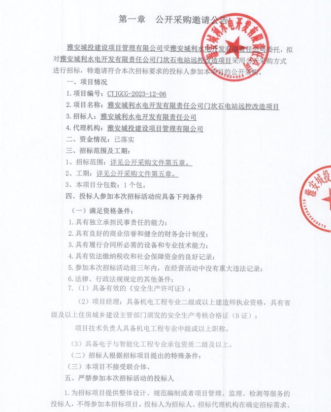 雅安城利水電開發(fā)有限責(zé)任公司門坎石電站遠(yuǎn)控改造項目公開采購邀請公告