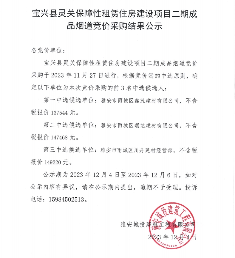 寶興縣靈關保障性租賃住房建設項目二期成品煙道競價采購結(jié)果公示