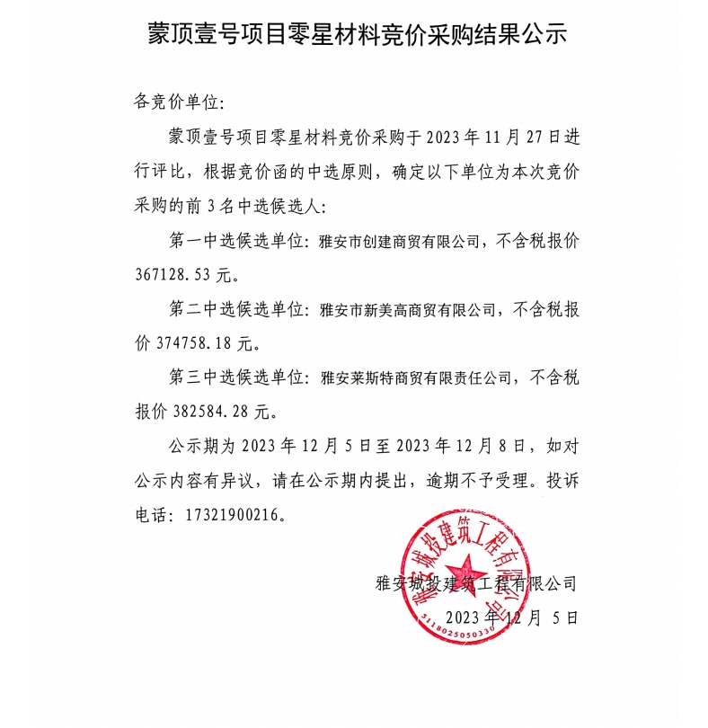 蒙頂壹號項(xiàng)目零星材料競價采購結(jié)果公示