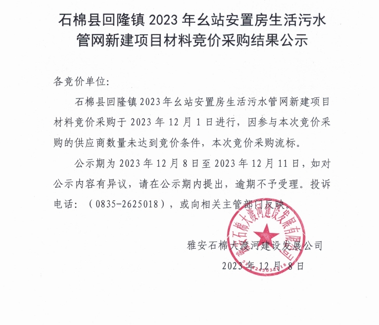 石棉縣回隆鎮(zhèn)2023年幺站安置房生活污水管網新建項目材料競價采購結果公示