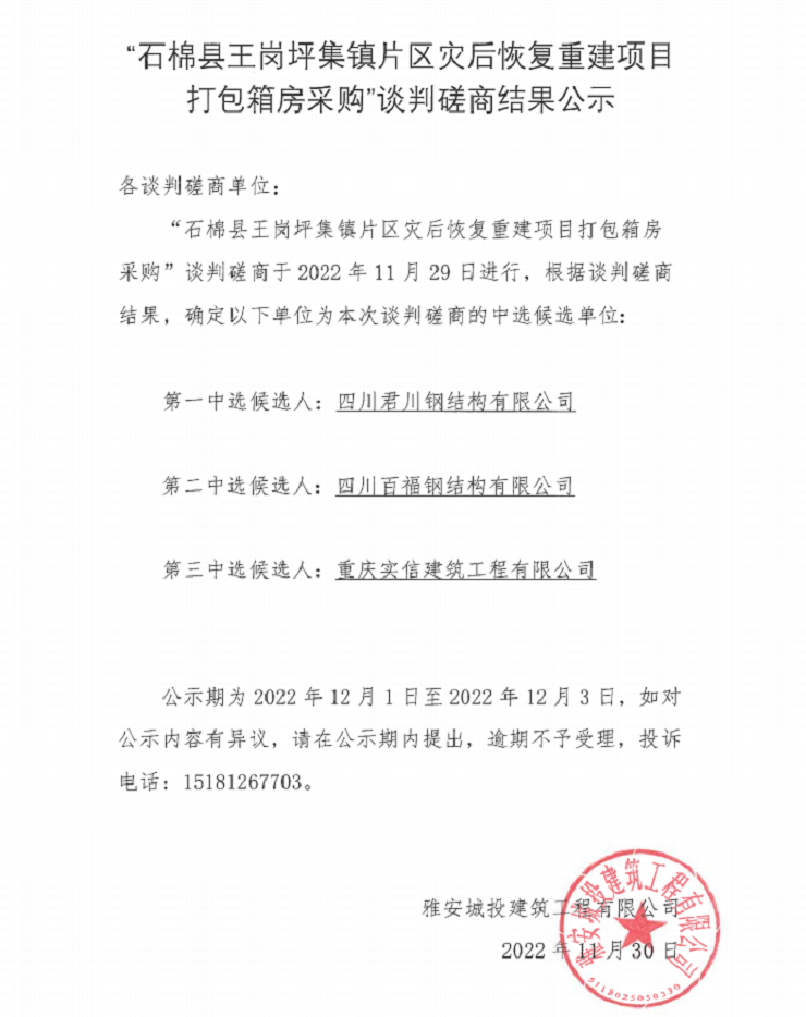 “石棉縣王崗坪集鎮(zhèn)片區(qū)災(zāi)后恢復(fù)·重建項目打包箱房采購”談判磋商結(jié)果公示