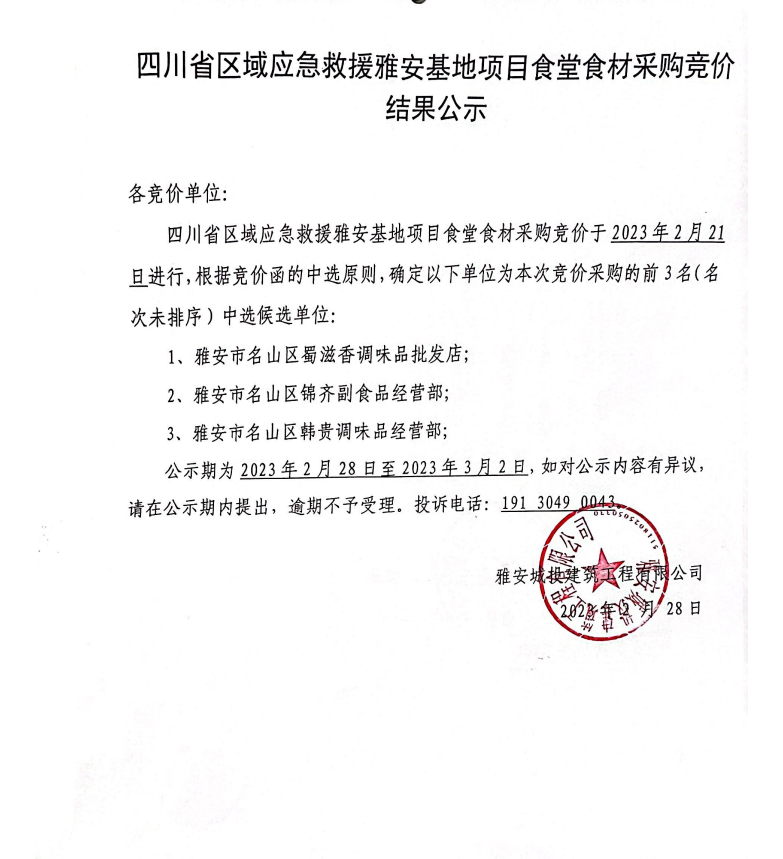 四川省區(qū)域應(yīng)急救援雅安基地項(xiàng)目食堂食材采購(gòu)競(jìng)價(jià)結(jié)果公示