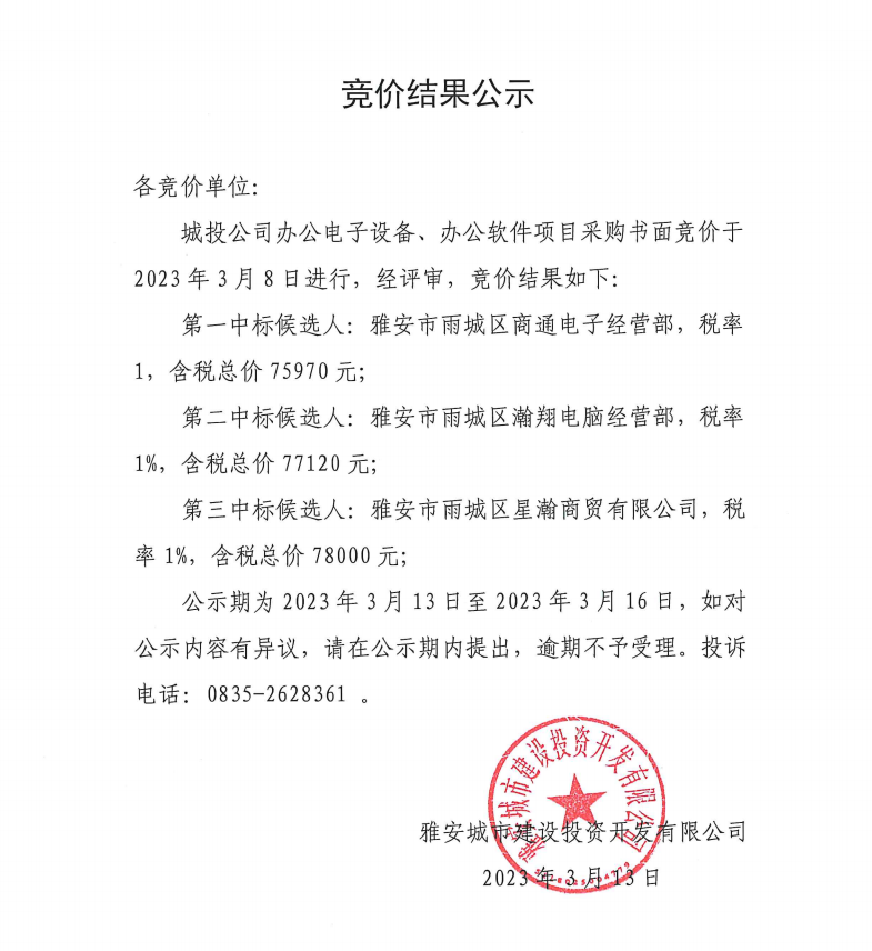 城投公司辦公電子設備、辦公軟件項目采購競價結(jié)果公示
