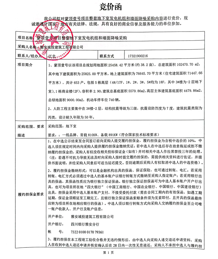 蒙頂壹號(hào)項(xiàng)目整套地下室發(fā)電機(jī)組和墻面降噪采購競價(jià)公告