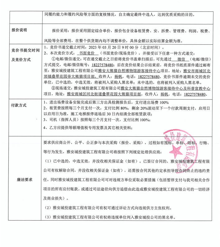 雅安大熊貓自然博物館游客接待中心及科普宣教中心項目施工升降機租賃采購競價公告