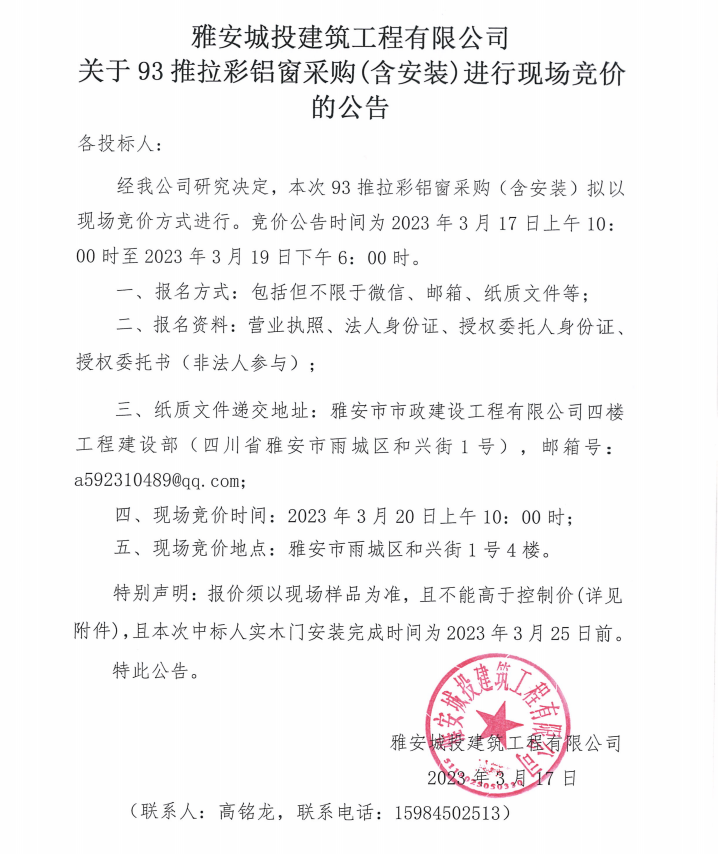 雅安城投建筑工程有限公司關(guān)于93推拉彩鋁窗采購(含安裝)進行現(xiàn)場競價的公告