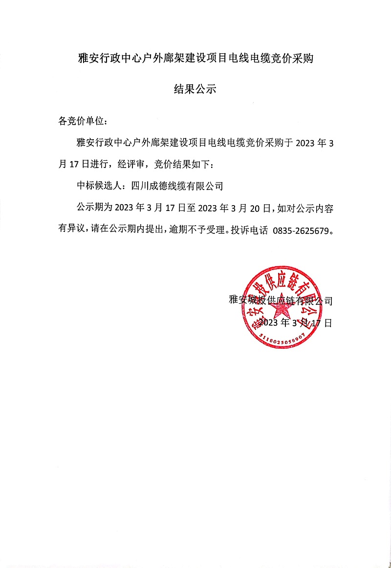 雅安行政中心戶(hù)外廊架建設(shè)項(xiàng)目電線(xiàn)電纜競(jìng)價(jià)采購(gòu)結(jié)果公示