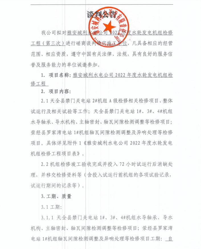 雅安城利水電公司2022年度水輪發(fā)電機(jī)組檢修工程(第三次)磋商談判公告