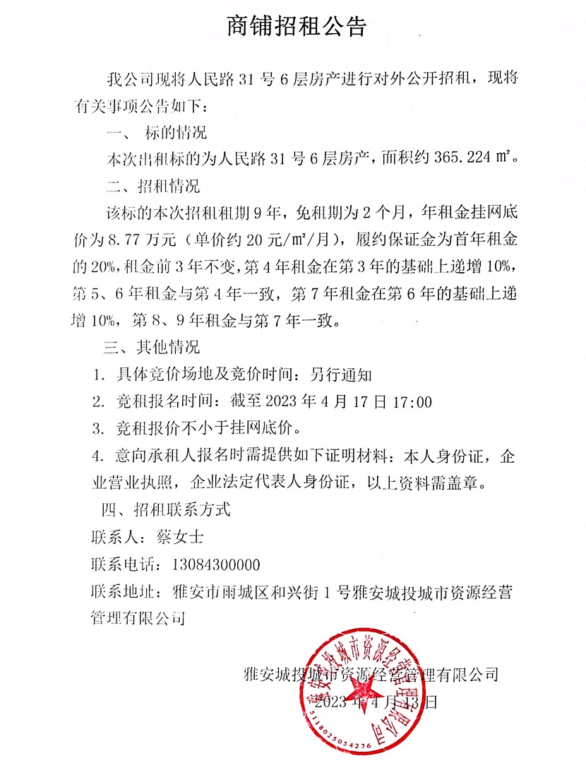 人民路31號(hào)6層房產(chǎn)商鋪招租公告