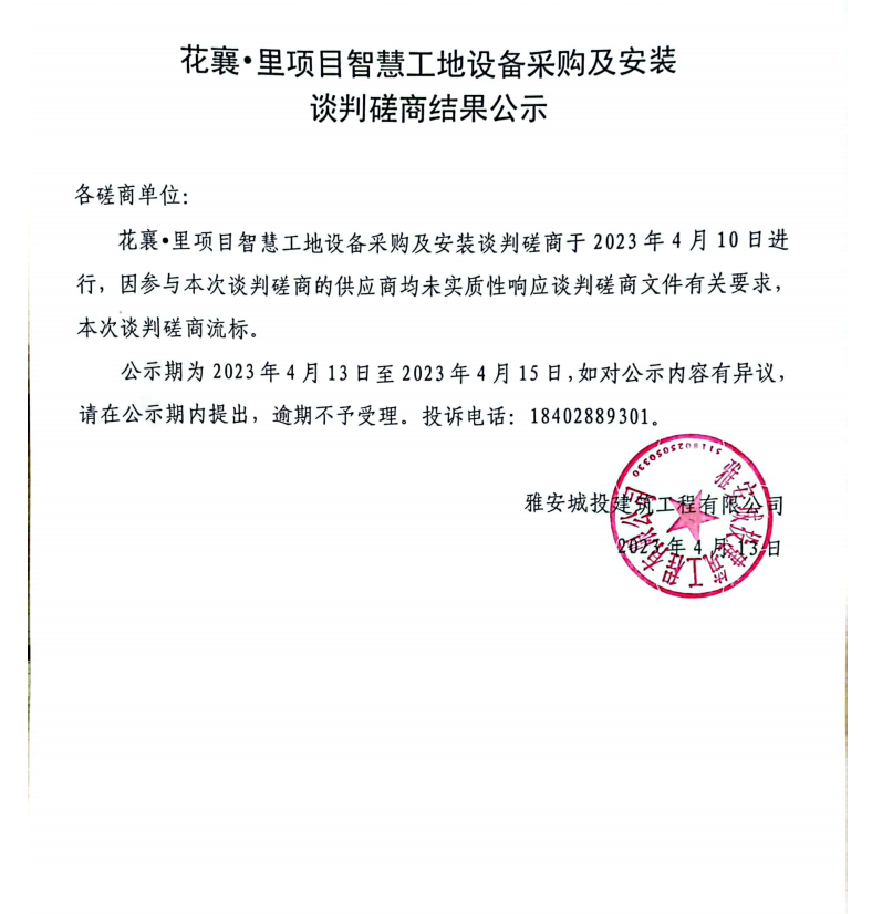 花襄·里項(xiàng)目智慧工地設(shè)采購備及安裝談判磋商結(jié)果公示