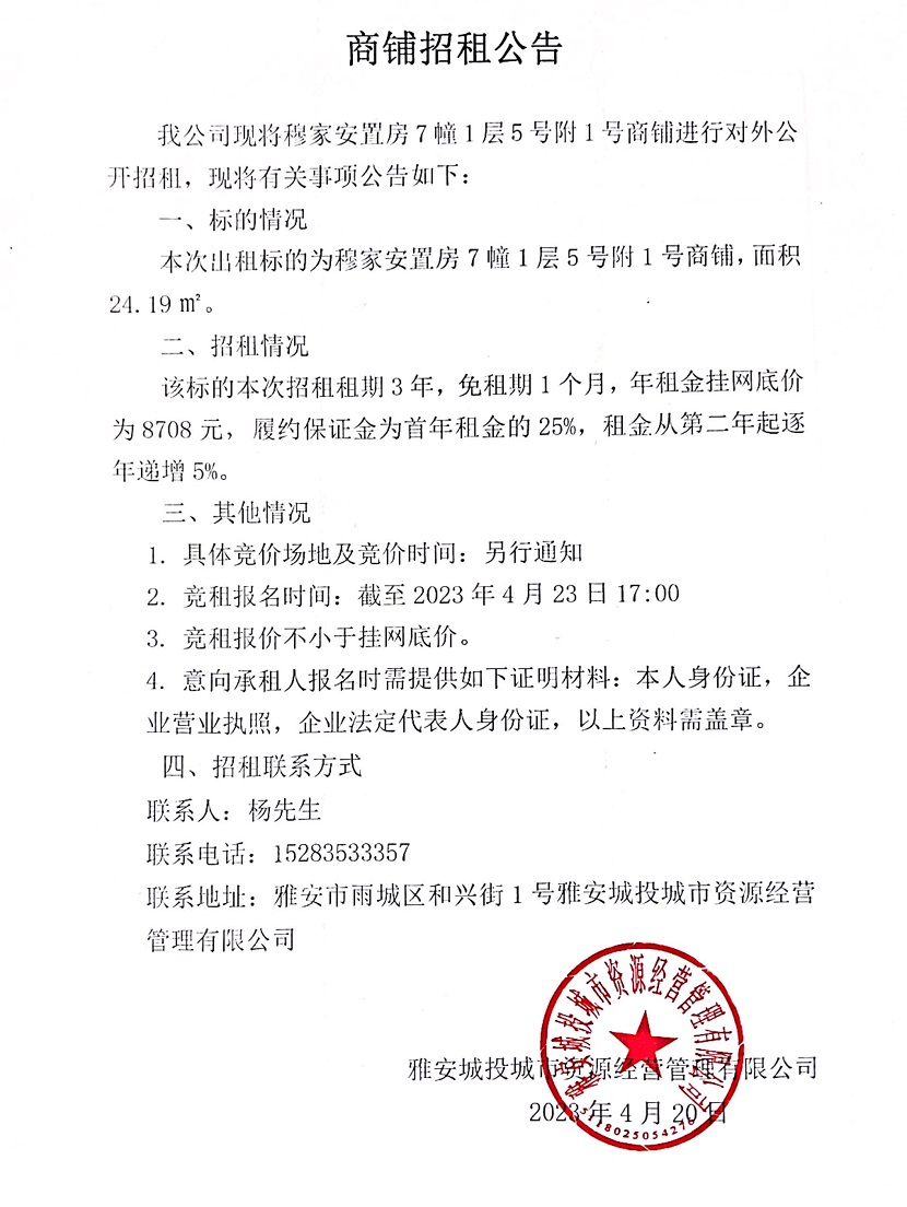穆家安置房7幢1層5號(hào)附1號(hào)商鋪招租公告