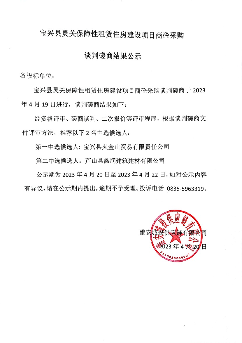 寶興縣靈關保障性租賃住房建設項目商砼采購談判磋商結(jié)果公示