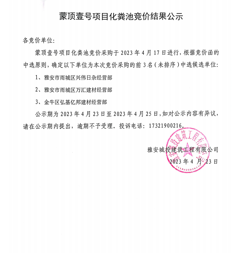 蒙頂壹號(hào)項(xiàng)目化糞池競(jìng)價(jià)結(jié)果公示