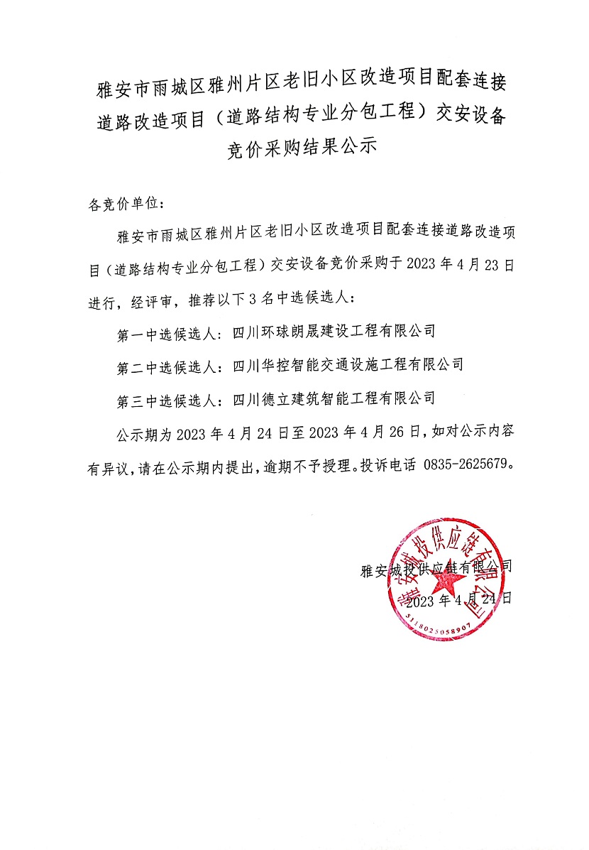 雅安市雨城區(qū)雅州片區(qū)老舊小區(qū)改造項(xiàng)目配套連接道路改造項(xiàng)目(道路結(jié)構(gòu)專(zhuān)業(yè)分包工程)交安設(shè)備競(jìng)價(jià)采購(gòu)結(jié)果公示