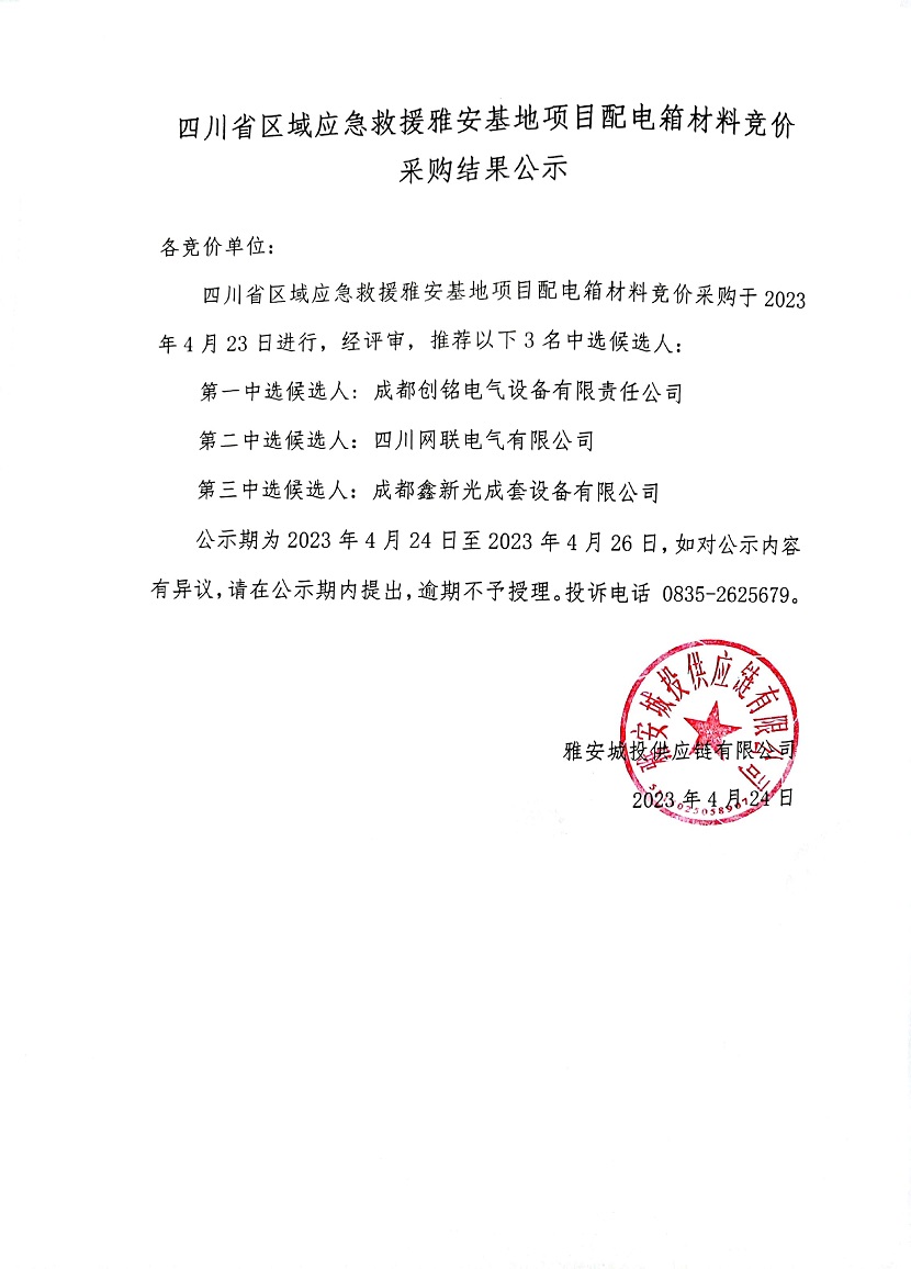 四川省區(qū)域應(yīng)急救援雅安基地項(xiàng)目配電箱材料競(jìng)價(jià)采購(gòu)結(jié)果公示