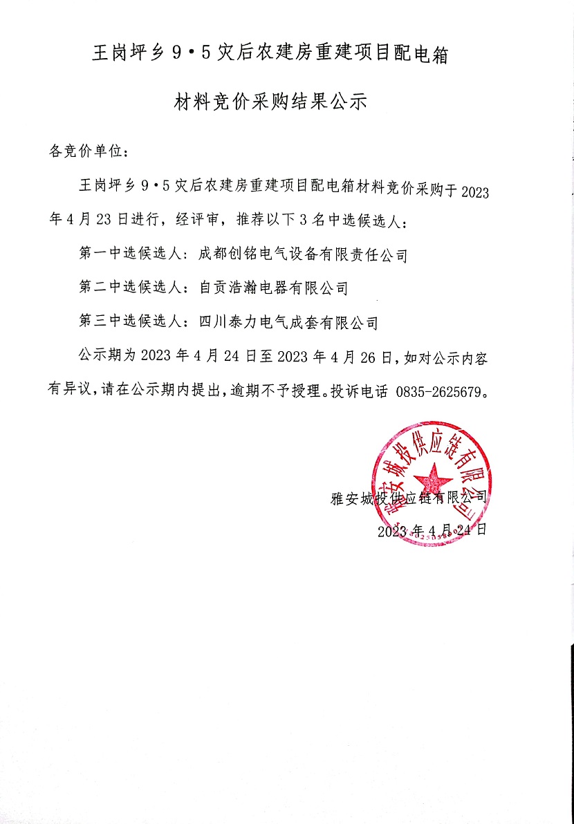 王崗坪鄉(xiāng)9·5災(zāi)后農(nóng)建房重建項(xiàng)目配電箱材料競價(jià)采購結(jié)果公示