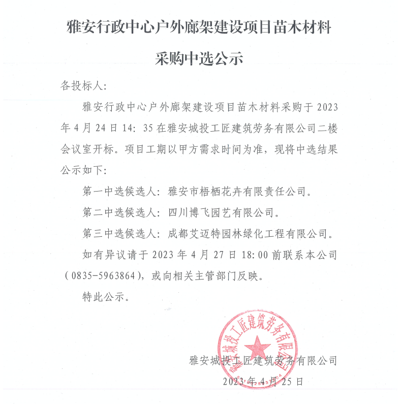 雅安行政中心戶外廊架建設(shè)項(xiàng)目苗木材料采購中選公示