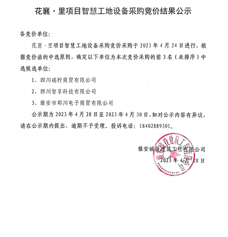 花襄·里項目智慧工地設(shè)備采購競價結(jié)果公示