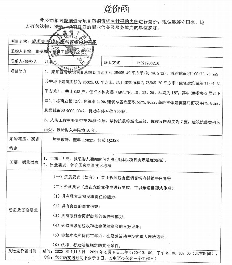 蒙頂壹號(hào)項(xiàng)目塑鋼窗鋼內(nèi)襯采購(gòu)內(nèi)容競(jìng)價(jià)公告