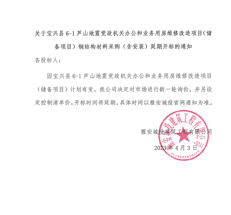 關(guān)于寶興縣6-1蘆山地震黨政機(jī)關(guān)辦公和業(yè)務(wù)用房維修改造項(xiàng)目(儲(chǔ)備項(xiàng)目)鋼結(jié)構(gòu)材料采購(含安裝)延期開標(biāo)的通知