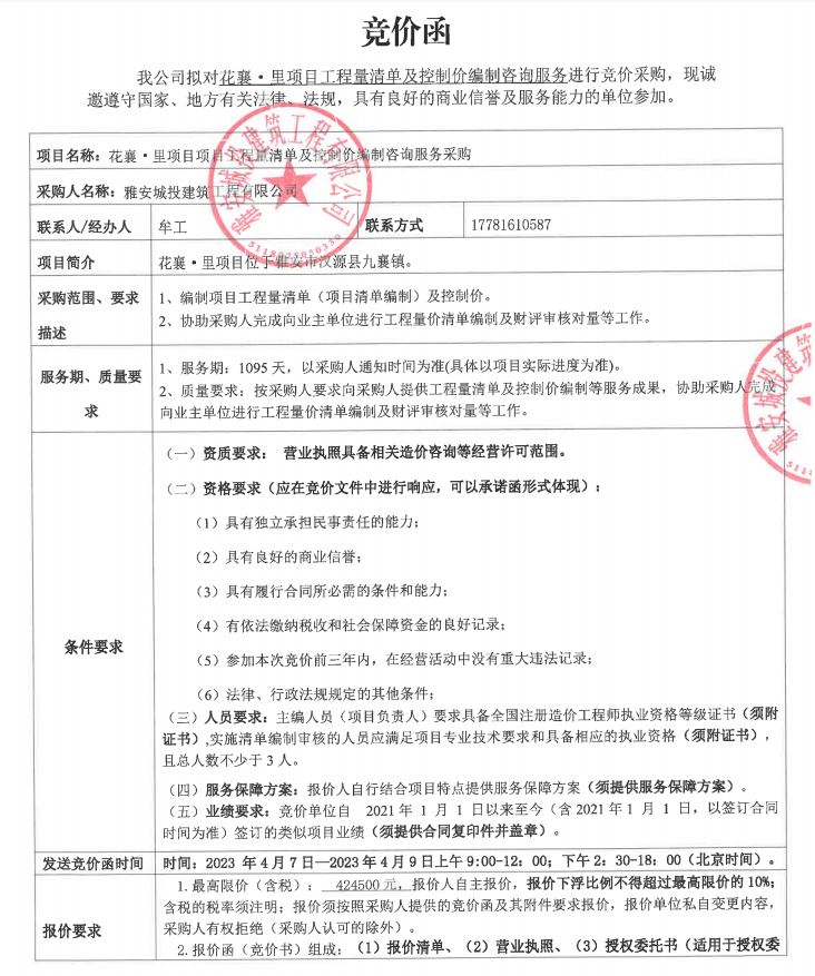 花襄·里項目工程量清單及招標控制價編制咨詢服務(wù)采購競價公告