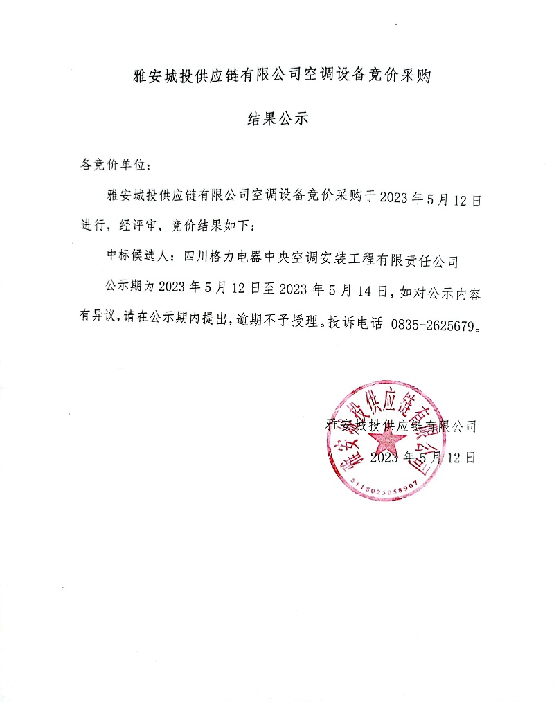 雅安城投供應(yīng)鏈有限公司空調(diào)設(shè)備競價采購結(jié)果公示