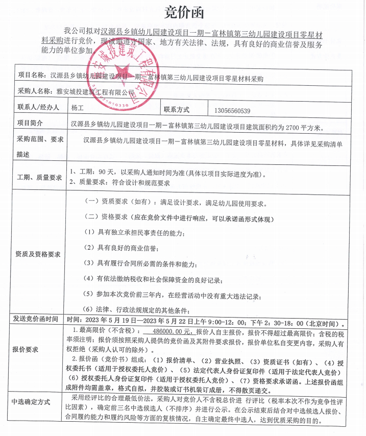 漢源縣鄉(xiāng)鎮(zhèn)幼兒園建設項目一期一富林鎮(zhèn)第三幼兒園建設項目零星材料采購競價公告