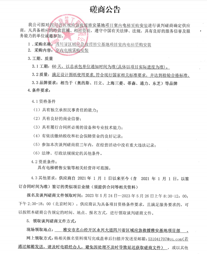 四川省區(qū)域應急救援雅安基地項目室內電梯采購安裝談判磋商公告
