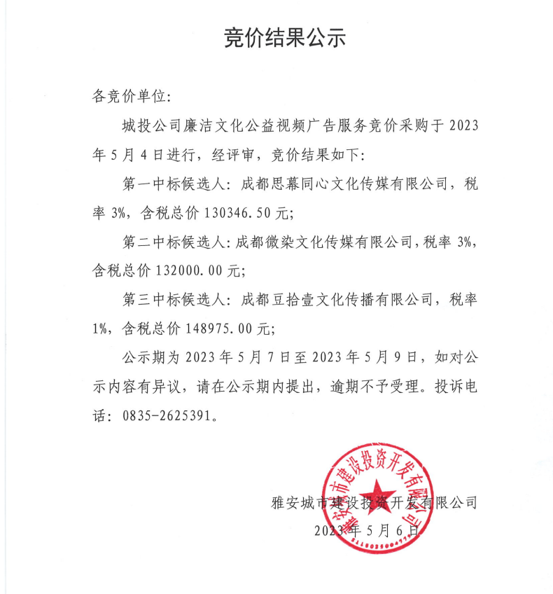 城投公司廉潔文化公益視頻廣告服務競價結果公示