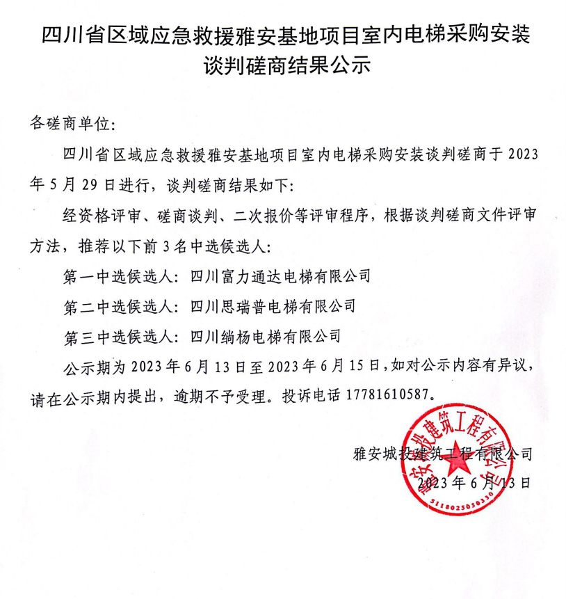 四川省區(qū)域應急救援雅安基地項目室內(nèi)電梯采購安裝談判磋商結(jié)果公示