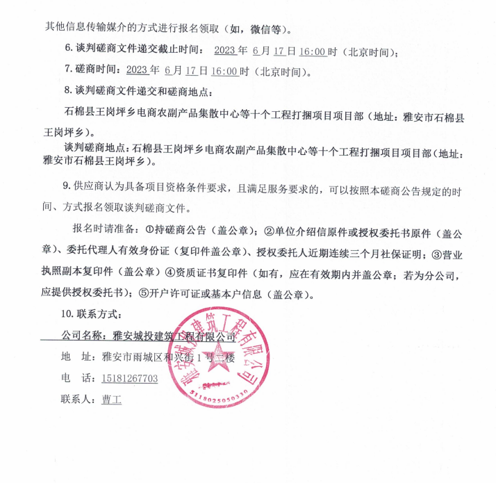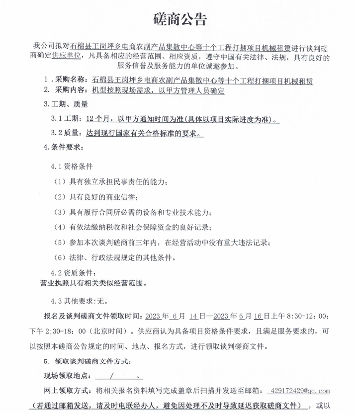 石棉縣王崗坪鄉(xiāng)電商農(nóng)副產(chǎn)品集散中心等十個(gè)工程打捆項(xiàng)目機(jī)械租賃談判磋商公告
