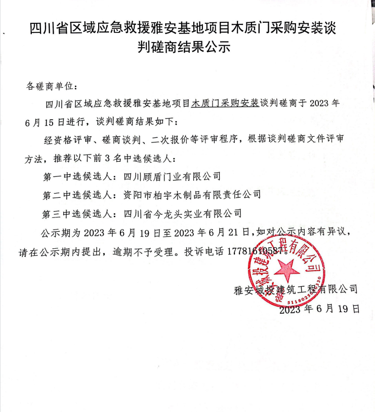 四川省區(qū)域應急救援雅安基地項目木質門采購安裝談判磋商結果公示