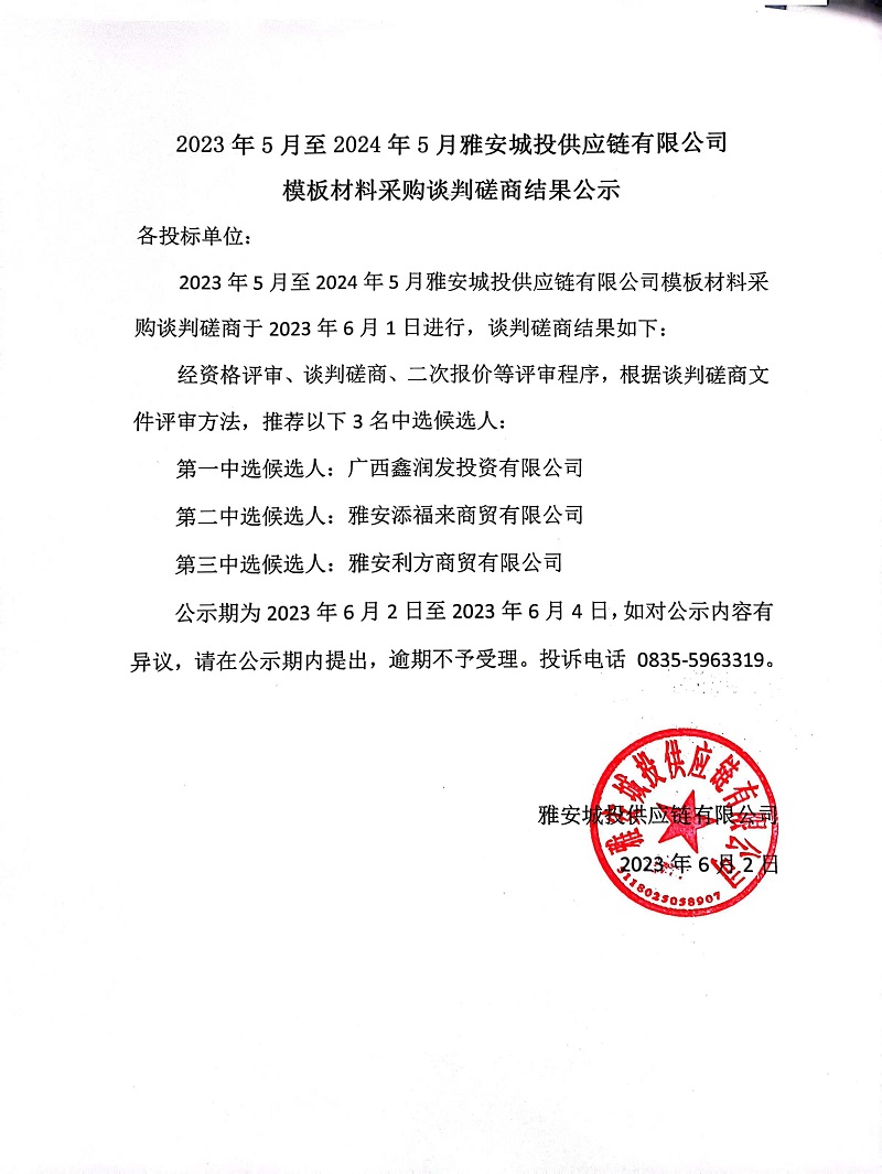 2203年5月至2024年5月雅安城投供應鏈有限公司模板材料采購談判磋商結果公示