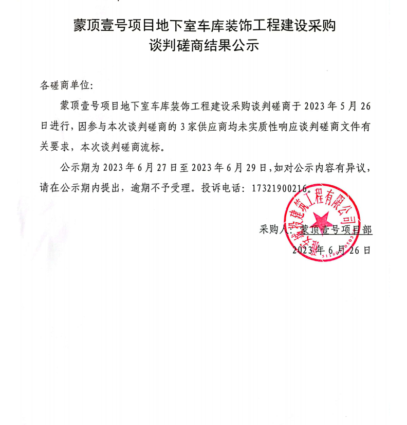 蒙頂壹號(hào)項(xiàng)目地下室車庫裝飾工程建設(shè)采購談判磋商結(jié)果公示