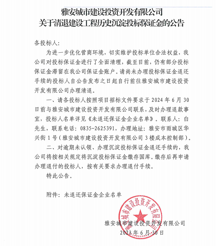 雅安城市建設投資開發(fā)有限公司關于清退建設工程歷史沉淀投標保證金的公告