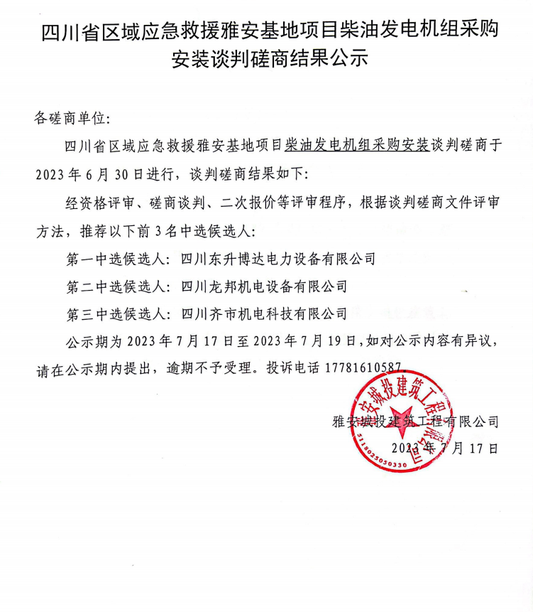 四川省區(qū)域應(yīng)急救援雅安基地項(xiàng)目柴油發(fā)電機(jī)組采購(gòu)安裝談判磋商結(jié)果公示