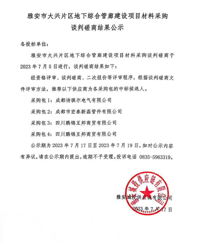 雅安市大興片區(qū)地下綜合管廊建設(shè)項(xiàng)目材料采購談判磋商結(jié)果公示