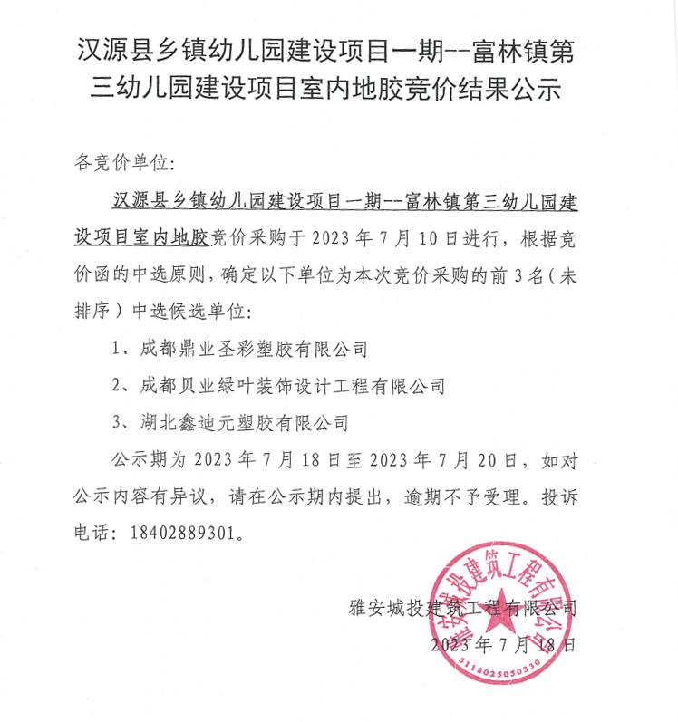漢源縣鄉(xiāng)鎮(zhèn)幼兒園建設(shè)項(xiàng)目一期--富林鎮(zhèn)第三幼兒園建設(shè)項(xiàng)目室內(nèi)地膠競(jìng)價(jià)結(jié)果公示
