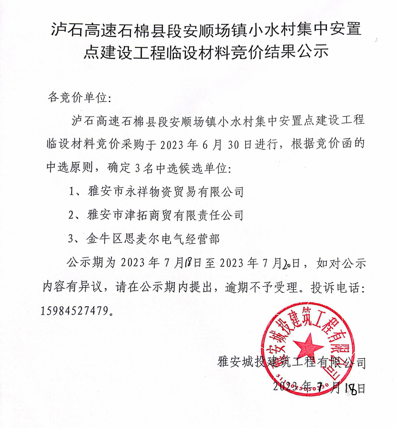瀘石高速石棉縣段安順場鎮(zhèn)小水村集中安置點(diǎn)建設(shè)工程臨設(shè)材料競價(jià)結(jié)果公示