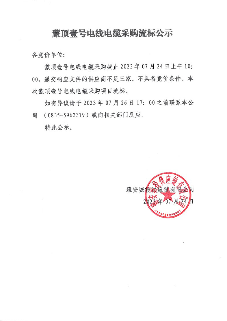 蒙頂壹號電線電纜采購流標公示