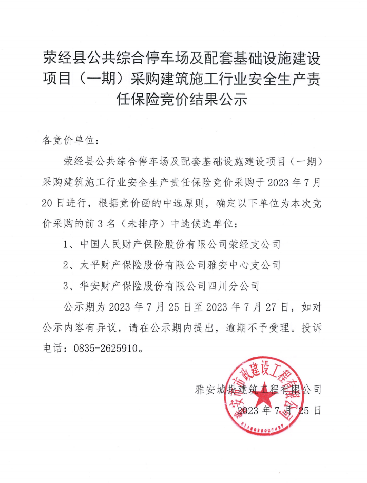 滎經(jīng)縣公共綜合停車場及配套基礎設施建設項目(一期)采購建筑施工行業(yè)安全生產(chǎn)責任保險競價結果公示