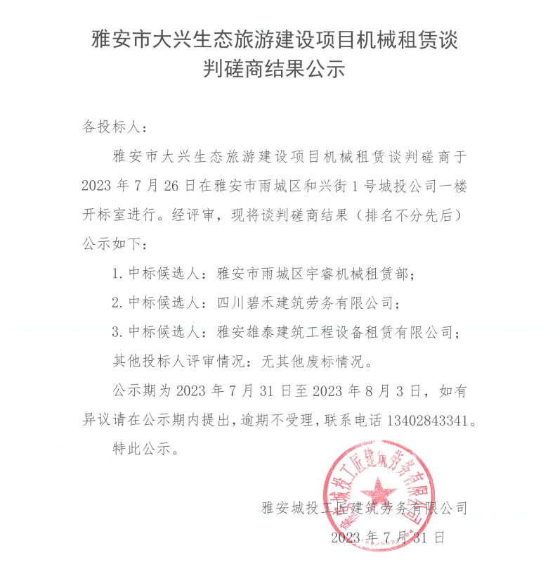 雅安市大興生態(tài)旅游建設(shè)項(xiàng)目機(jī)械租賃談判磋商結(jié)果公示