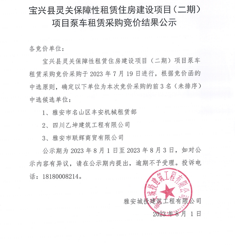 寶興縣靈關(guān)保障性租賃住房建設(shè)項(xiàng)目(二期)項(xiàng)目泵車租賃采購競(jìng)價(jià)結(jié)果公示