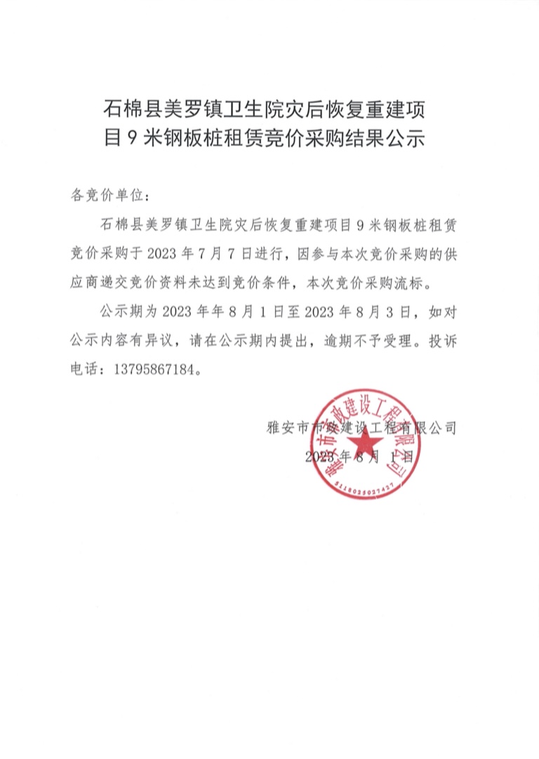石棉縣美羅鎮(zhèn)衛(wèi)生院災(zāi)后恢復(fù)重建項(xiàng)目9米鋼板樁租賃競價采購結(jié)果公示