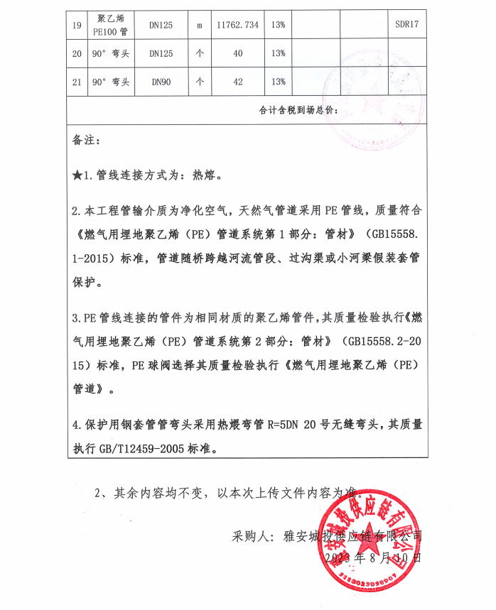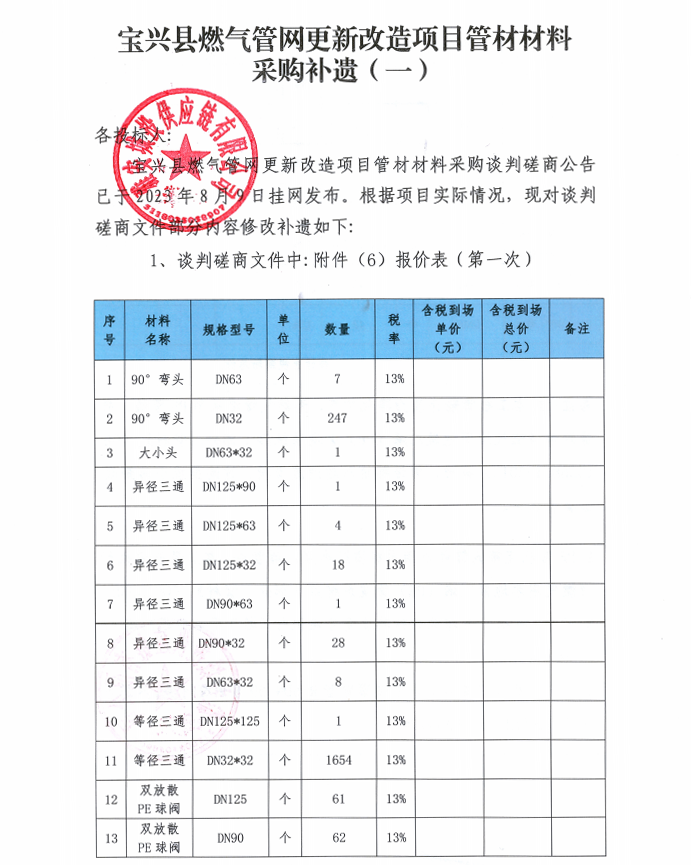 寶興縣燃?xì)夤芫W(wǎng)更新改造項目管材材料采購補(bǔ)遺(一)