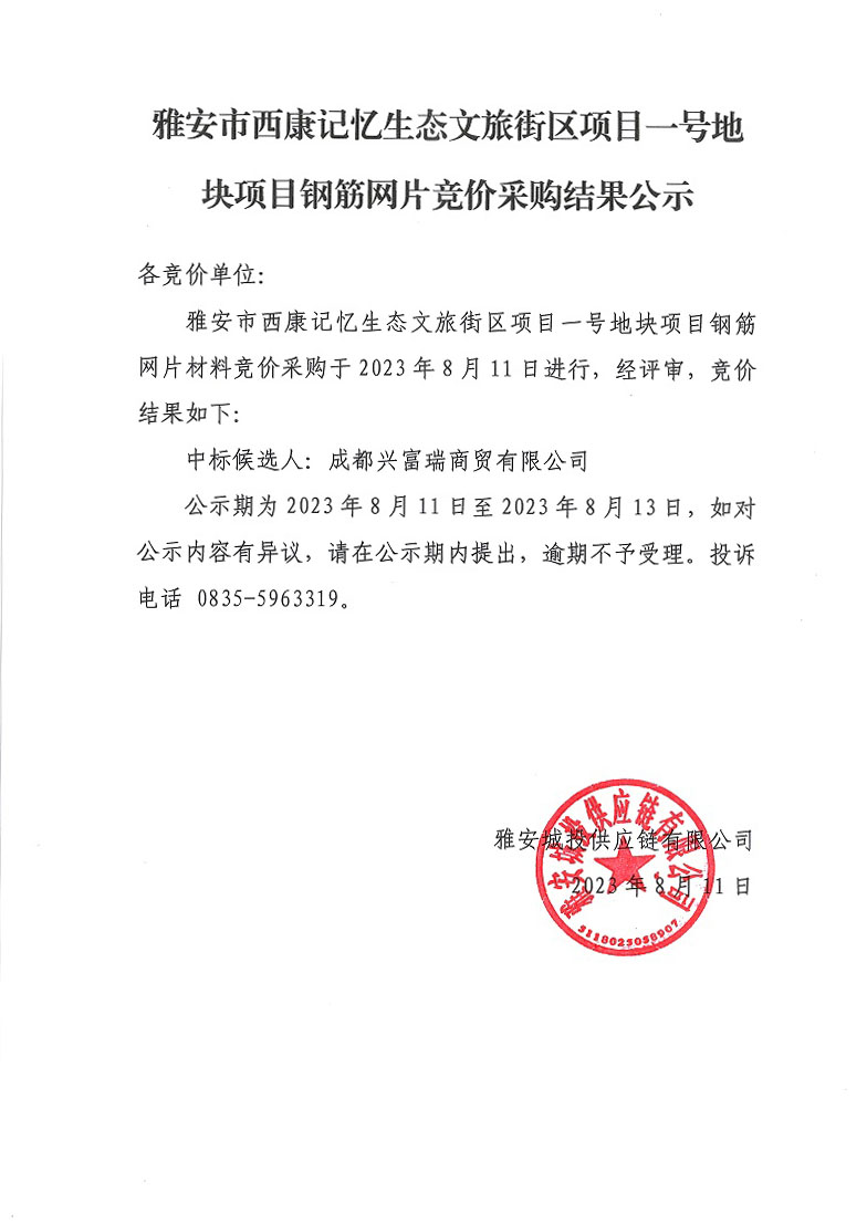 雅安市西康記憶生態(tài)文旅街區(qū)項目一號地塊項目鋼筋網(wǎng)片競價采購結(jié)果公示