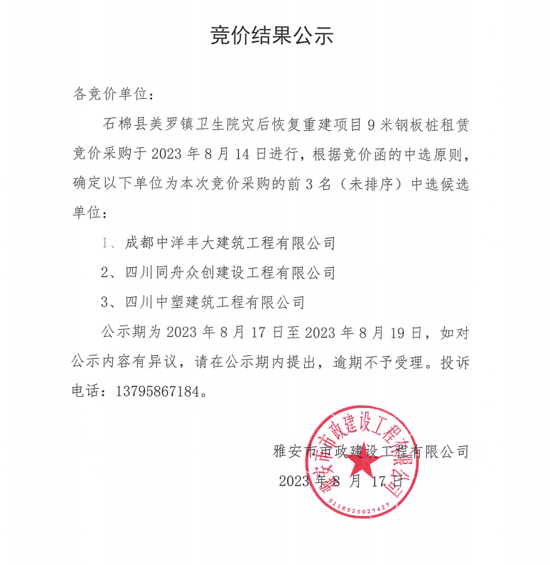 石棉縣美羅鎮(zhèn)衛(wèi)生院災(zāi)后恢復(fù)重建項(xiàng)目9米鋼板樁租賃競價結(jié)果公示