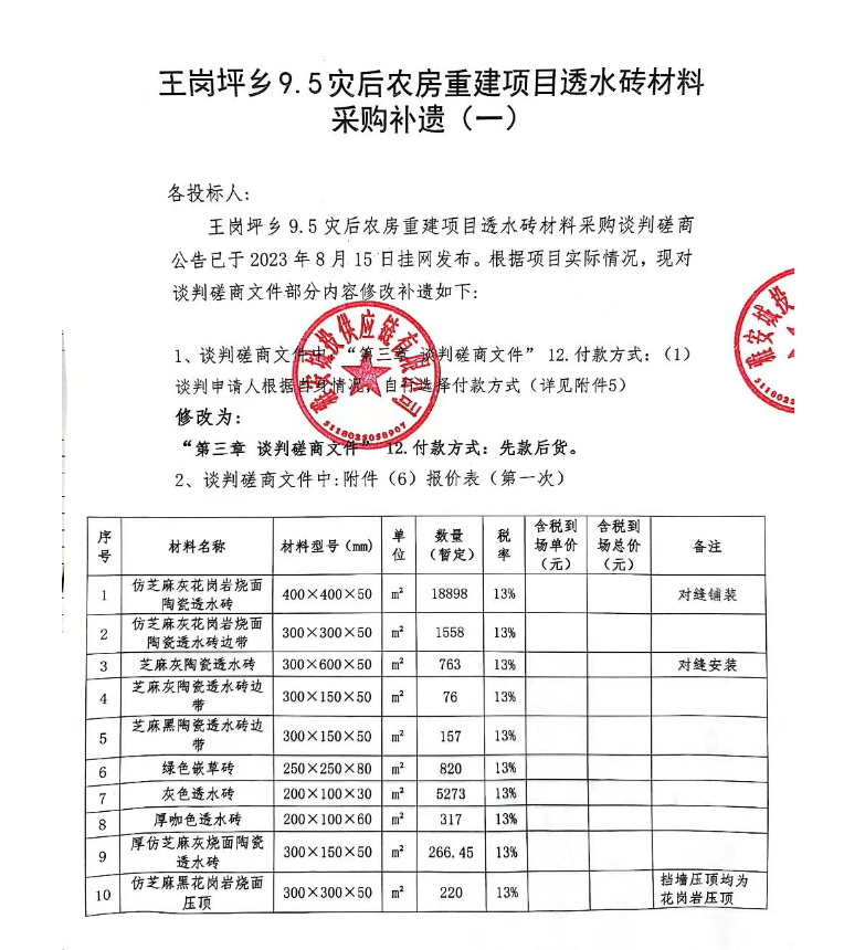 王崗坪鄉(xiāng)9.5災后農房重建項目透水磚材料采購補遺(一)